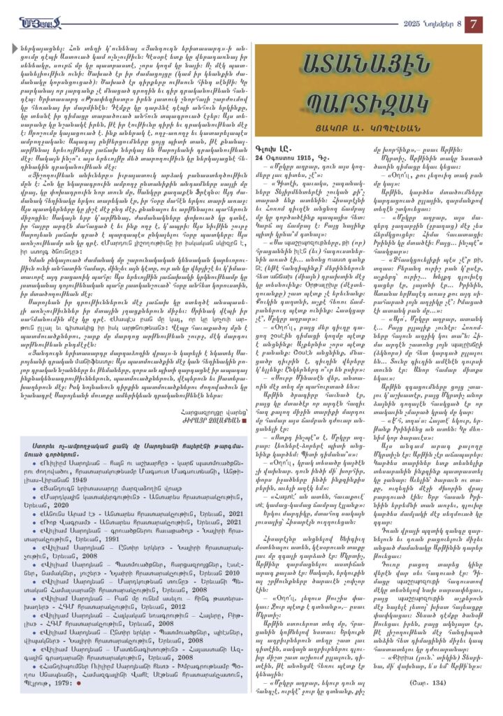 Studies in Haratch Daily and Haratch Cultural Supplement, (Haratch Midk yév Aroust), Paris, France, Senior Contributing Writer